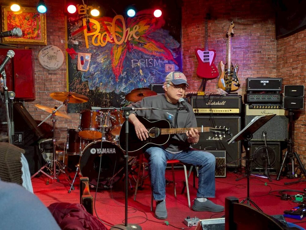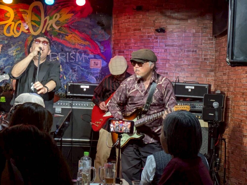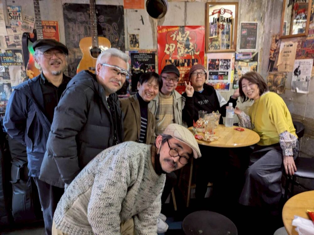 学生時代からブルースの弾語りのスタイル。ゆったりしたシャッフルのリズムと渋〜い歌声。ボトルネックも哀愁のある音色で引き込まれるステージでした。40年ぶりに聞いた同期の友人が「タイムスリップしたみたい」と言ったのもうなづけます。