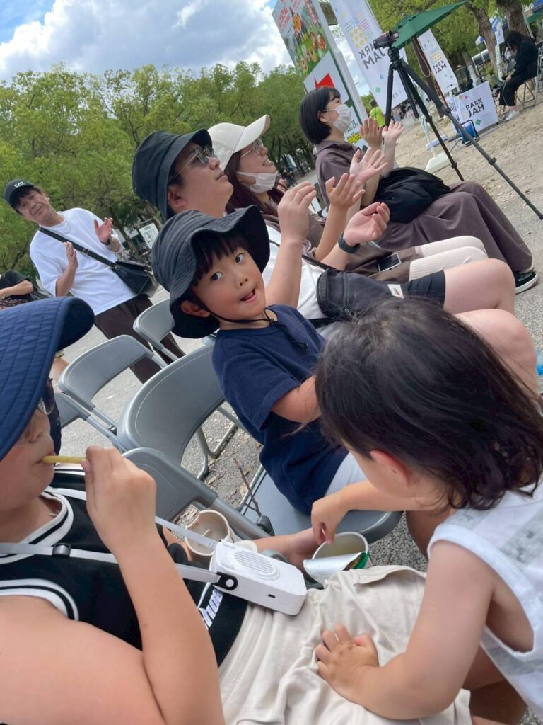 公園ということで、子供たちファミリーを呼んでおりまして、久しぶりにいとこ同士で遊べて楽しかったようです。噴水に入ってずぶぬれになることは想定内。着替えと帽子を持参するよう連絡済でした。こども向けの曲やディズニーの曲、参加型の曲などセットリストも考えていきました。